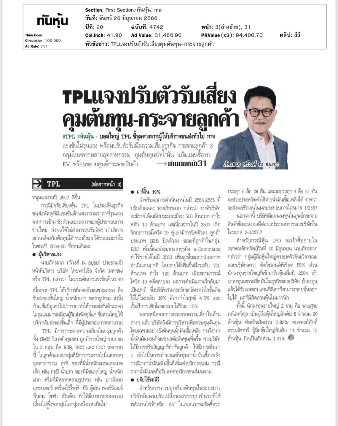 จิปาถะ TPL แจงปรับตัวรับเสี่ยงคุ้มต้นทุน-กระจายลูกค้า 26 มิถุนายน 2566 แชร์ ที่เกี่ยวข้อง จิปาถะ "รมว.อรรถพล" นำทีมตรวจสอบการฟื้นฟูโรงไฟฟ้าจะนะ ยืนยันระบบไฟฟ้าภาคใต้มั่นคง 08 ธันวาคม 2568 จิปาถะ “รมต.สันติ ปิยะทัต” มอบหมายผู้ช่วยรัฐมนตรีฯ เร่งฟื้นฟูและเยียวยาผู้ประสบอุทกภัย จ.ตรัง 03 ธันวาคม 2568 จิปาถะ “รมต.สันติ ปิยะทัต” ประเดิม ช่วยผู้ประสบภัยน้ำท่วม - ฟื้นฟูเมือง อ.รัษฎา จ.ตรัง 28 พฤศจิกายน 2568 จิปาถะ “ปลัดพลังงาน” ติดตามน้ำท่วมต่อเนื่อง เร่งขนส่งน้ำมันและ LPG ไปยัง สตูล ปัตตานี ยะลา นราธิวาส หลังเส้นทางถูกตัดขาด 28 พฤศจิกายน 2568