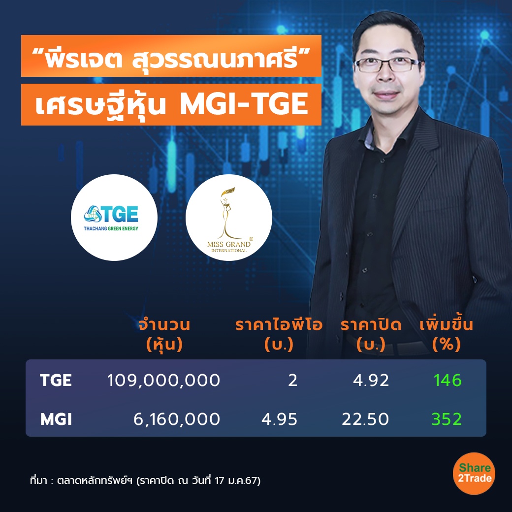หุ้นนางงามที่ขยันสร้างสถิติสูงสุดใหม่ต่อเนื่อง จากราคาไอพีโอ 4.95 บาท และราคาทดสอบจุดสูงสุดที 22.70 บาท (ณ วันที่ 17 ม.ค.67) “พีรเจต”ถือหุ้น MGI จำนวน 6,160,000 หุ้น ราคาปิดที่ 22.50 บาท มูลค่าพอร์ตลงทุนเพิ่มเป็น 138.60 ล้านบาท จากเงินลงทุน 30.49 ล้านบาท หรือมีกำไรกว่า 108.11 ล้านบาท