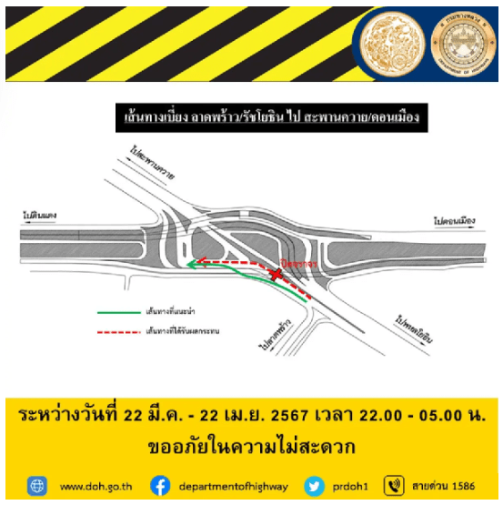 โดยจะทำการปิดถนนใต้สะพานคู่ขนานข้ามแยกดอนเมือง - ดินแดง/สะพานควาย (ทิศทางลาดพร้าว/รัชโยธินมุ่งหน้าสะพานควาย/ดอนเมือง) โปรดสังเกตป้ายเตือนและปฏิบัติตามป้ายแนะนำ เพื่อความปลอดภัยของผู้ใช้รถใช้ถนน