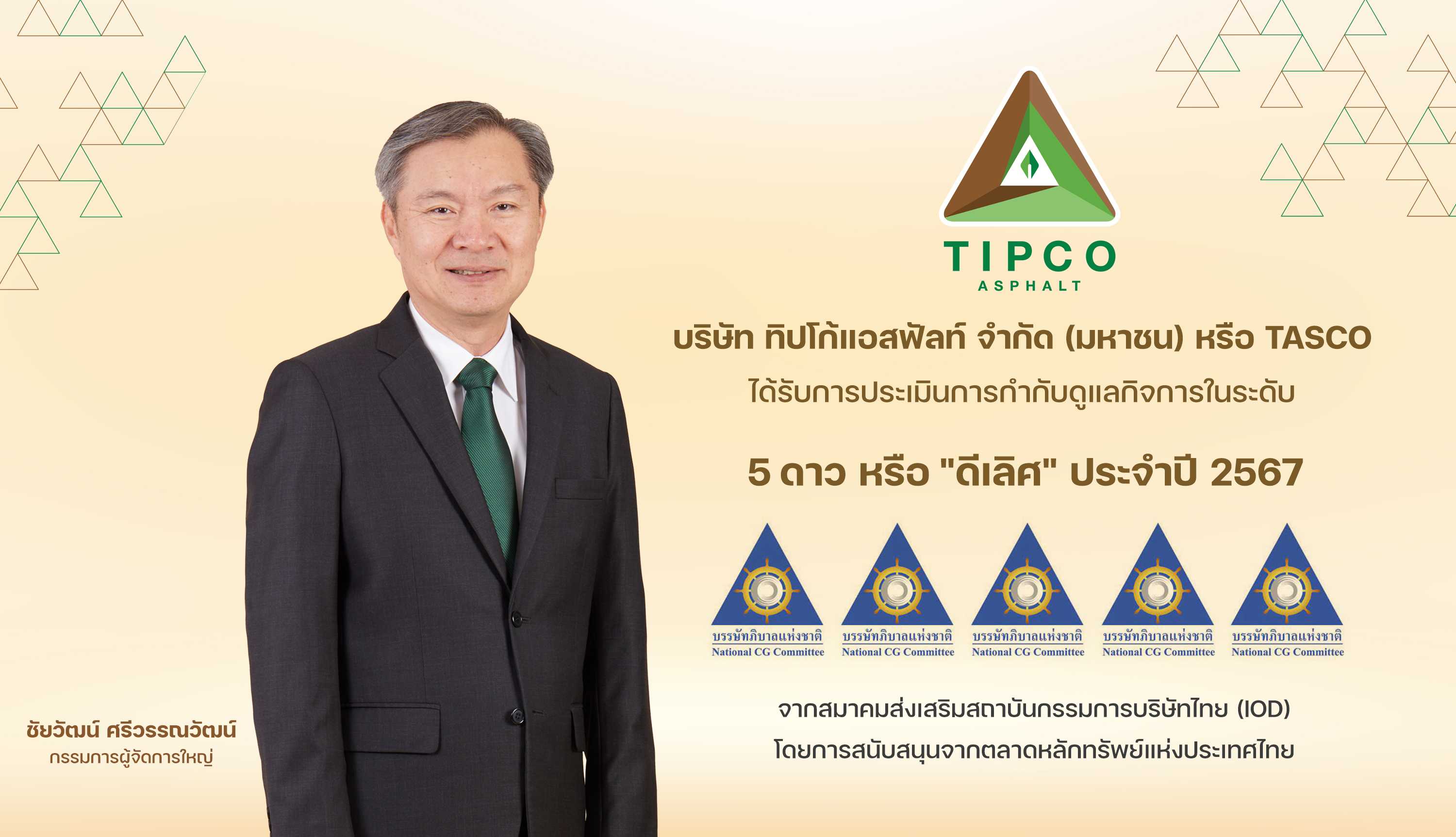 บริษัท ทิปโก้แอสฟัลท์ จำกัด (มหาชน) หรือ TASCO ได้รับคะแนนการประเมินการกำกับดูแลกิจการในระดับ 5 ดาว หรือ “ดีเลิศ” (Excellent CG Scoring) จากสมาคมส่งเสริมสถาบันกรรมการบริษัทไทย (IOD) โดยการสนับสนุนจากตลาดหลักทรัพย์แห่งประเทศไทย